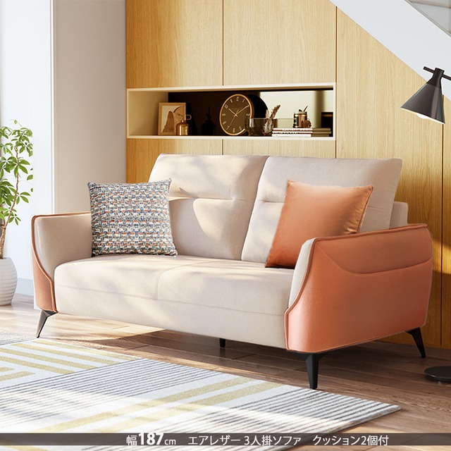 ■ [商品を探す]から【LARソファ】を検索していただくとサイズ違い、色違いが表示されます。ぜひご覧ください。 ..................................................... 【素材】 フレーム:無垢材、合板、繊維板 脚:スチール 張地:テクスチャー生地 中材:ウレタン、背もたれ/クッション:グースウール+ポリエステル 【商品サイズ】 187×90×90cm 【商品重量】 44kg 【梱包サイズ】 190×94×55cm 【カラー】 4色(ベージュオレンジ、グレー、ブルー、ライトグレーブルー) 【その他】 ■商品の説明 肌触りの良い生地と羽毛混合クッションを使用した3人掛けソファです。 レザーファブリックを使用しており,高度な繊維技術とコーティング技術で、革の光沢感と質感を保ち、生地の柔らかさと弾力性を兼ね備えています。 肌にも優しく、座り心地やもたれ心地が優れています。 2段式の高い背もたれが首、背中、腰をしっかりサポートし、柔らかいスポンジの座面で快適な座り心地。 無地のソファに彩りと華やかさをプラスするクッション2個付き。 スチール製の脚がモダンな印象。 ひじ掛け側面はポケット仕様。 ◆発注前のご注意 受注生産品です。ご注文後約1〜3か月ほどお届けまでに時間がかかります。受注生産品ですのでキャンセルはお受けできかねます。ご了承ください。 .................................................... ※送料無料(エリア条件あり) ※北海道・沖縄(本島)・北陸・信越・一部 山岳地域 や 遠隔地エリア は別途送料かかります。 ※サイズ・重量は概算です。 ※実際の商品の色にできるだけ近づけるよう撮影を行っておりますが、商品色はご使用のモニターによって実際の明るさや色と多少異なって見える場合がございます。 ※当店では代金引換はご利用いただけません。 ※ページ上で『購入可能』の状態でもタイミングによってはメーカー在庫が欠品している場合もございます。予めご了承下さいませ。 ※直射日光の当たる場所や高温多湿の場所でのご使用は変形、変色、カビの発生の原因となりますのでご使用をお避け下さい。 ..................................................... 【 お問い合わせ先 】 グローブ TEL:075-925-8835 在庫状況・納期等、お気軽にお問い合わせください。 LINEからもお問い合わせいただけます。 LINE IDは yz2024 上記 ID を、長押しでコピーしていただき、 LINEアプリで ID検索 をお願いいたします。 お客様担当:木村がお待ちしております。 【SHZO】