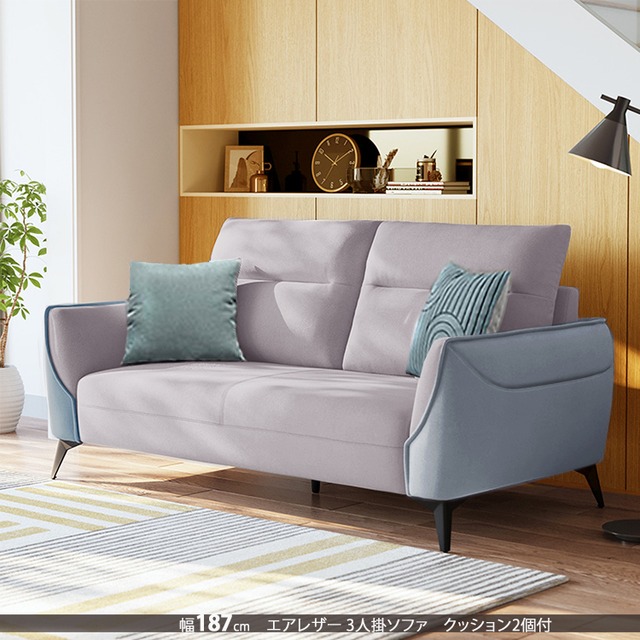 ソファ 3人掛け クッション付 ツートンカラー レザー調生地