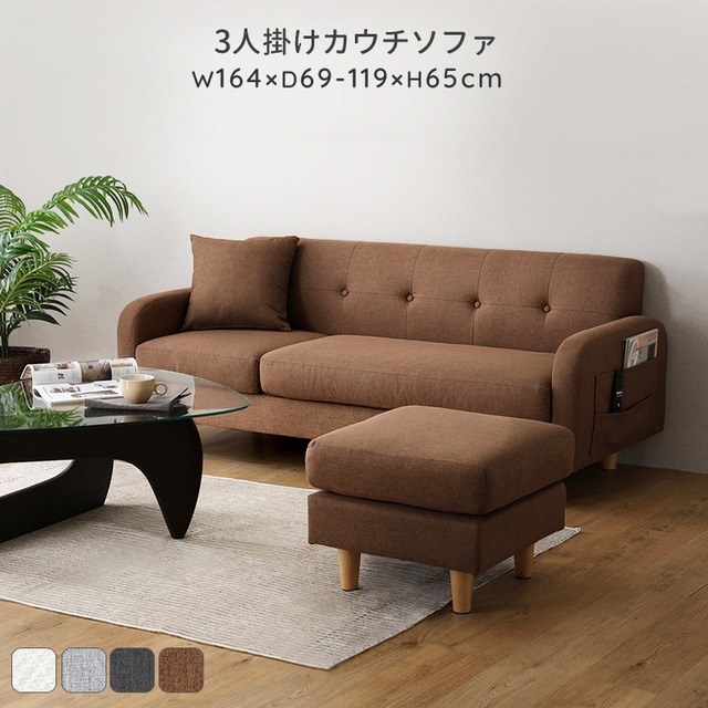 カウチソファ 3人掛け ZCT カバーリング 布張り ブラウン色 全4色 オットマン クッション付 収納ポケット付