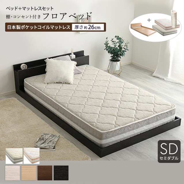 フロアベッド ポケットコイルマットレスセット (セミダブル) ローベッド 木目調 ホワイトオーク色 全4色 宮付 棚・コンセント付き 抗菌・防臭