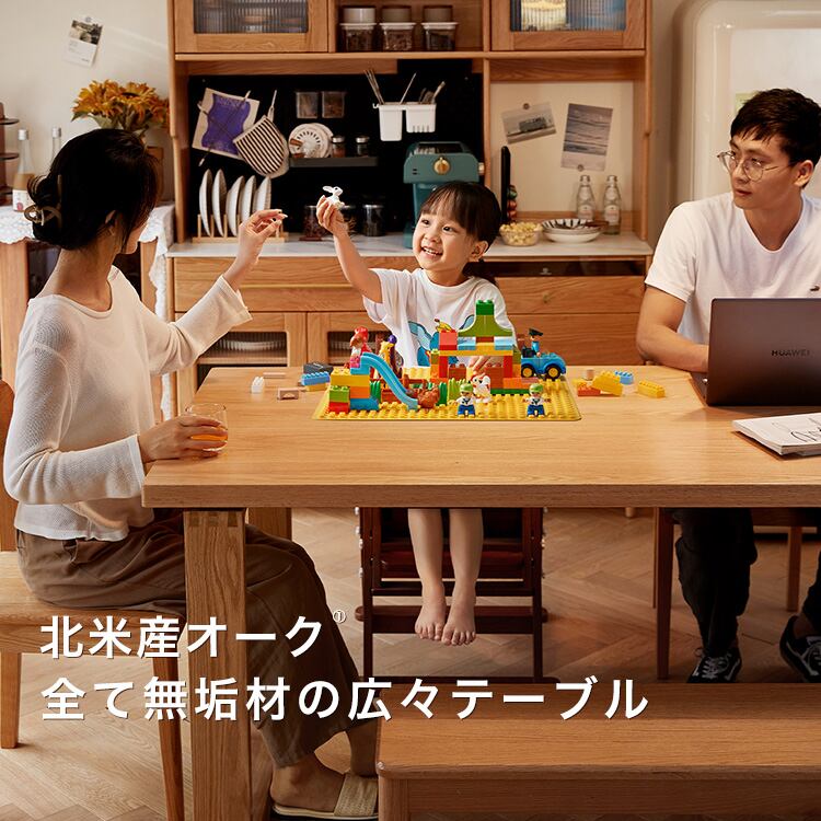 ■この商品は、北米産レッドオーク無垢材を使用した160cmのダイニングテーブルです。広々とした天板と3本の高品質な金属製の支えで、安定感と耐久性に優れています。テーブル下にはスチール補強バーを備え、しっかりとした構造が特徴です。