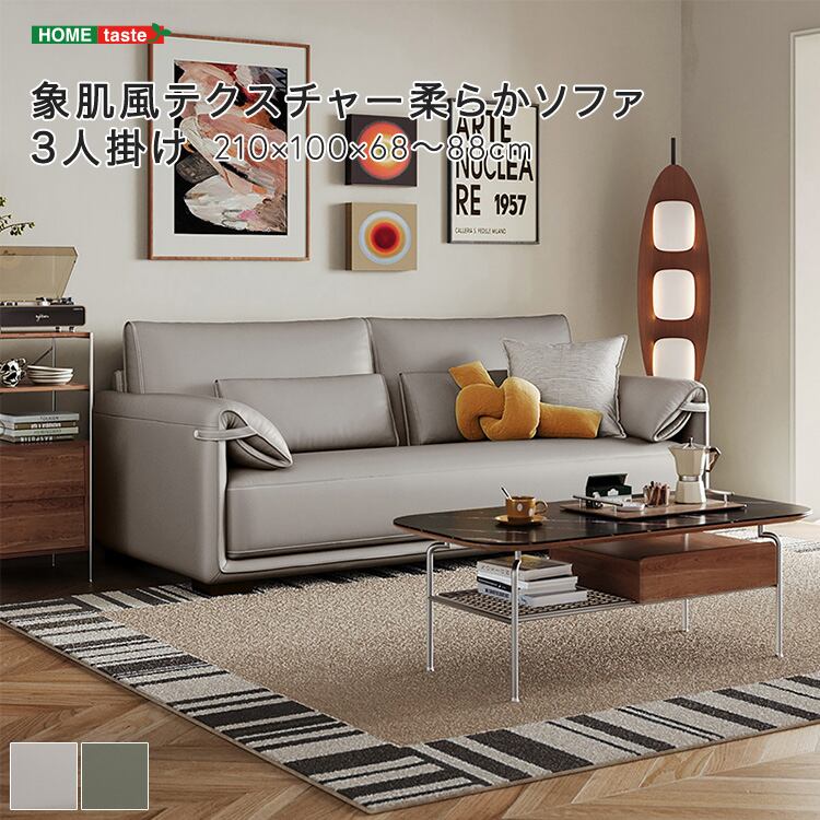 ソファ 3人掛け 象肌風テクスチャー 布張り 柔らか羽毛混クッション グリーン色 グレー色