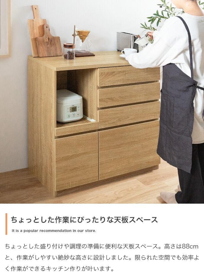 たっぷりお皿やお鍋を収納でき、キッチン周りの様々なものをこの1台にまとめて収納していただけます。また天板はカウンターとしても使えるため、調理時の作業台としてもぴったり。