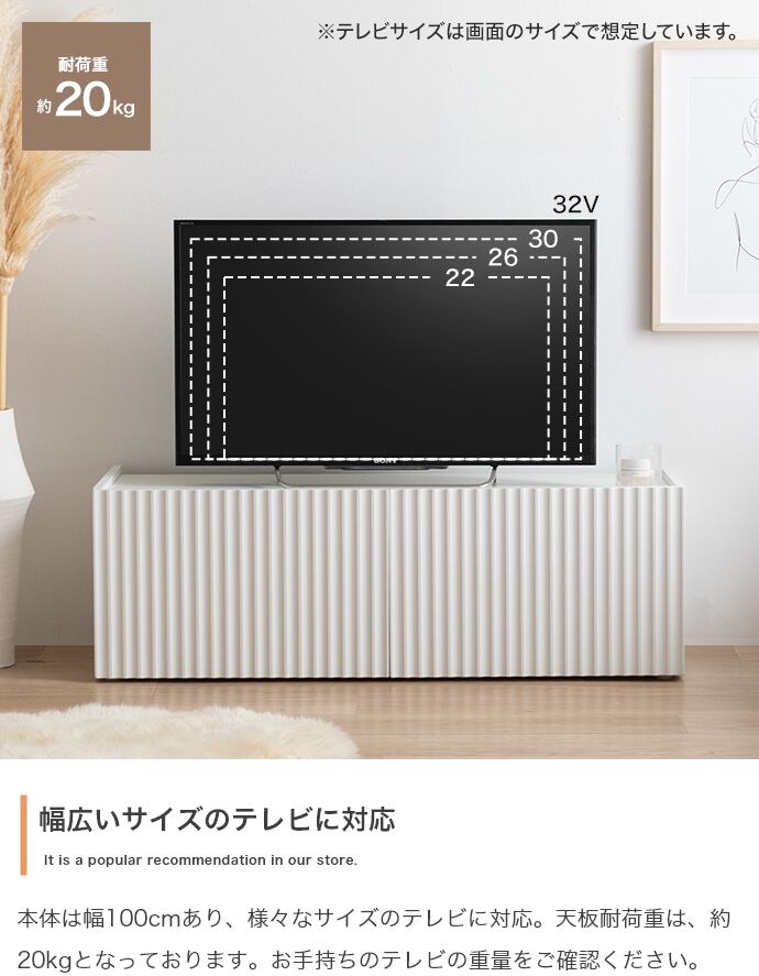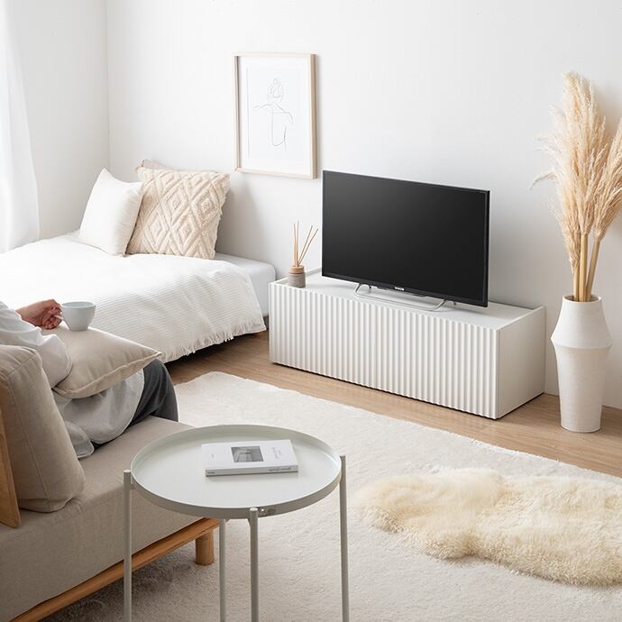清潔感のあるホワイトと波型扉が魅せるテレビ台。