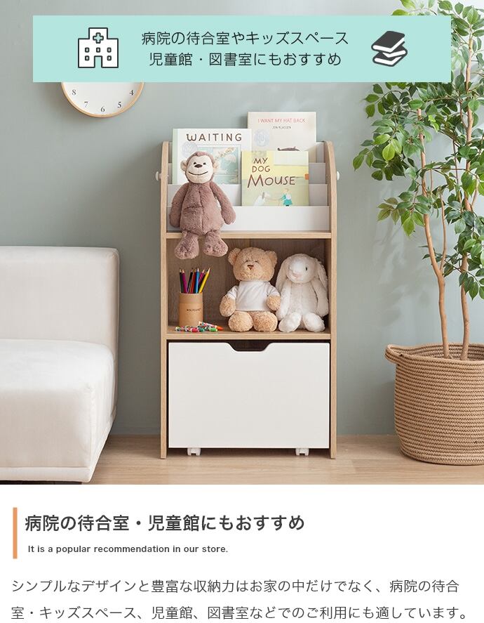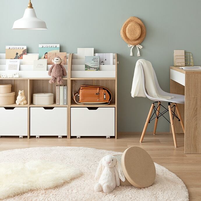 深さの異なる3つの絵本収納ポケット、何を収納しているか一目でわかるオープン収納、キャスター付きの大きな引き出し収納と大容量のラックは、お子様専用スペースとして設置することで、お子様の自発的なお片付けを誘導し、楽しくお片付けをする習慣へと繋げることができます。