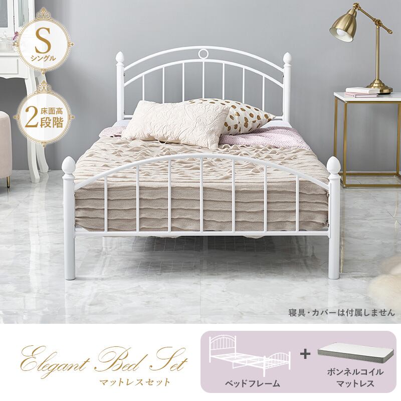 ベッド ボンネルコイルマットレスセット シングル パイプベッド FAL ベッド プリンセス ホワイト 組み立て式 エレガント 床面高2段階調節可能
