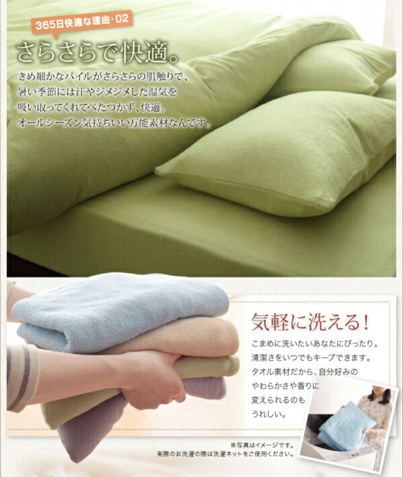 天然素材コットン100%。やわらかなタオルに包まれて眠る心地よさ。