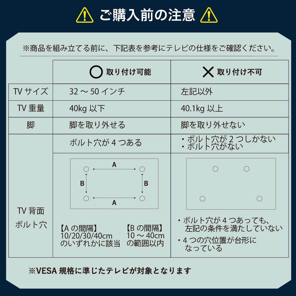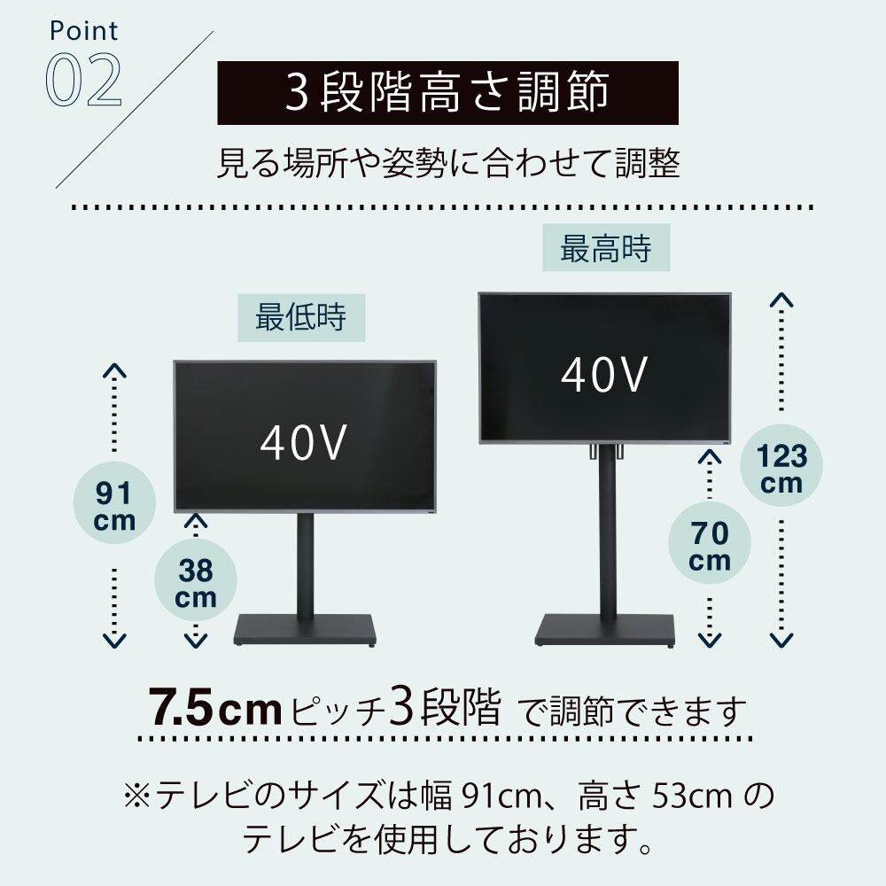 50V型まで対応し、左右それぞれ30度まで首振り可能で、3段階の高さ調節機能付き。どこからでも快適な視聴が可能です。