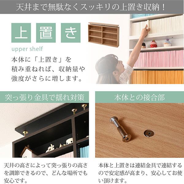 本棚 天井つっぱり式 薄型 90幅 文庫本 ラック 上置きセット 壁面収納 本収納 文庫本 漫画 CD DVD スリム 1cmピッチ 大収納ラック 木製