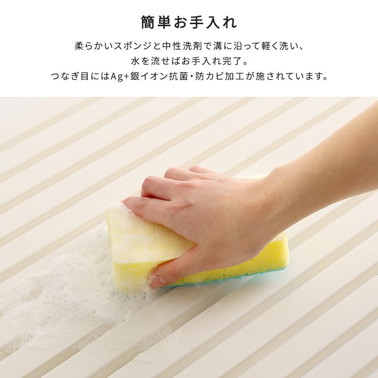 お手入れはやわらかいスポンジや中性の浴室用洗剤を使用して、溝にそって軽く洗って水を流すだけなので簡単にいつでも清潔にご使用いただけます。