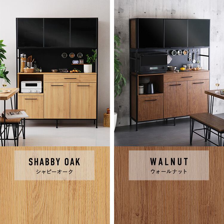 食器棚 キッチンボード ワイド 幅136cm マグネット収納 ブラックガラス 木目調 スライドテーブル レンジ台 GECK ヴィンテージ調 ブラウン ナチュラル