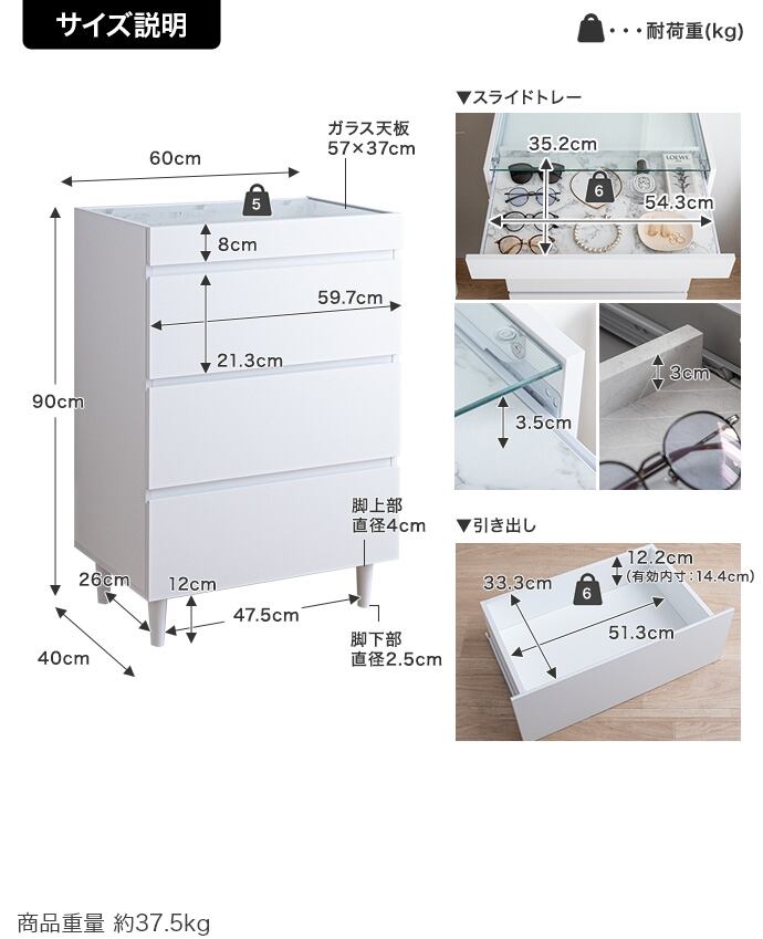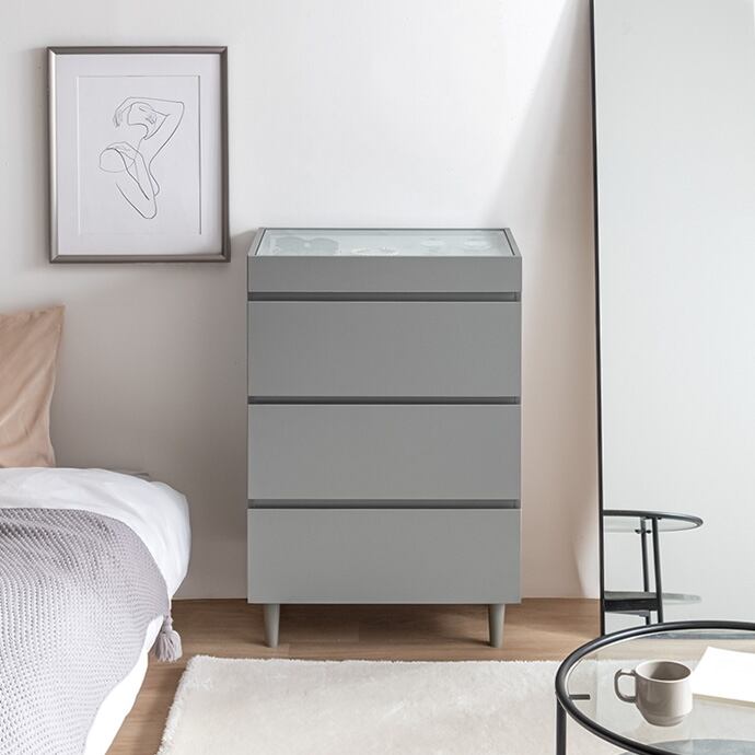 ガラス天板が美しい上段にアクセサリーを、下段はたっぷり収納できる3段仕様で、洋服や小物をすっきり整理可能。