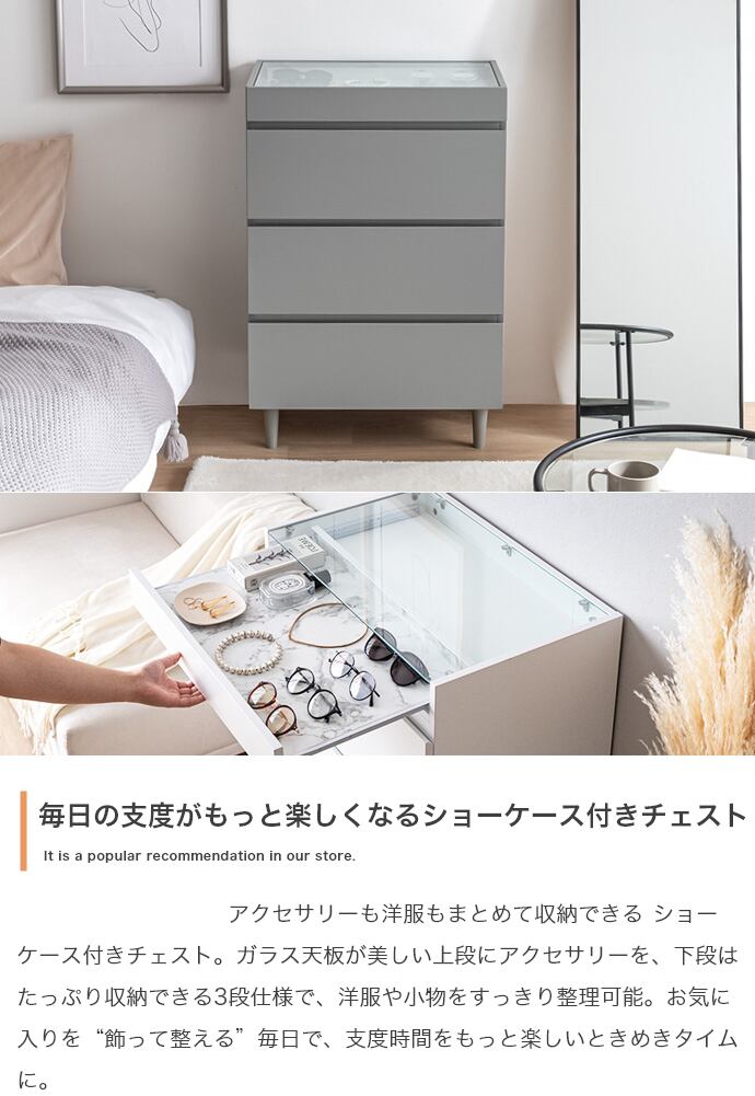 チェスト 60cm幅 ガラス天板ショーケース タンス 収納家具 Nana 白 グレー おしゃれ リビング リビングチェスト 引出し ロータイプ コンパクト 一人暮らし