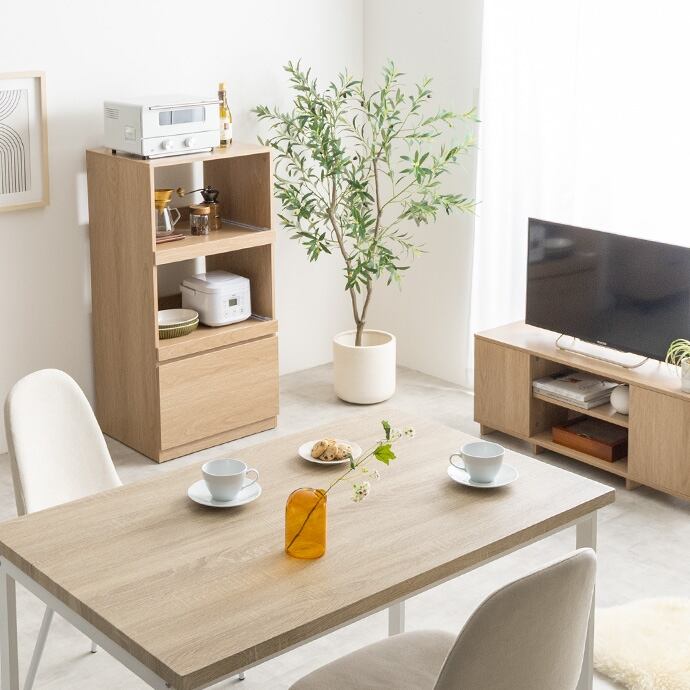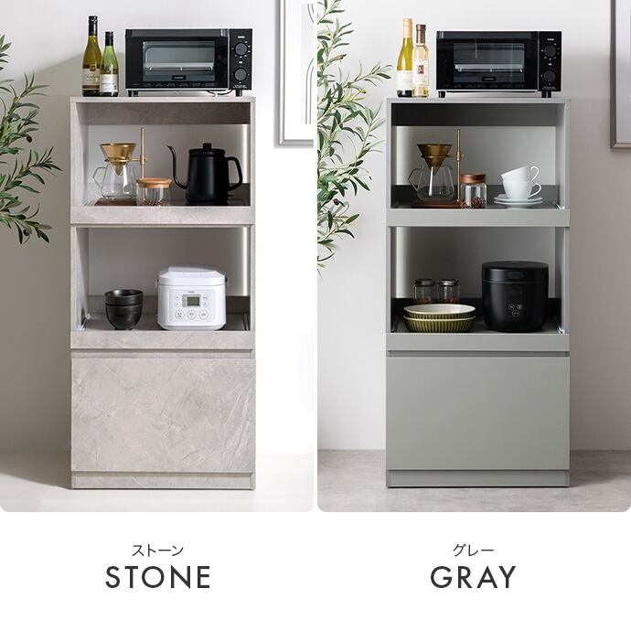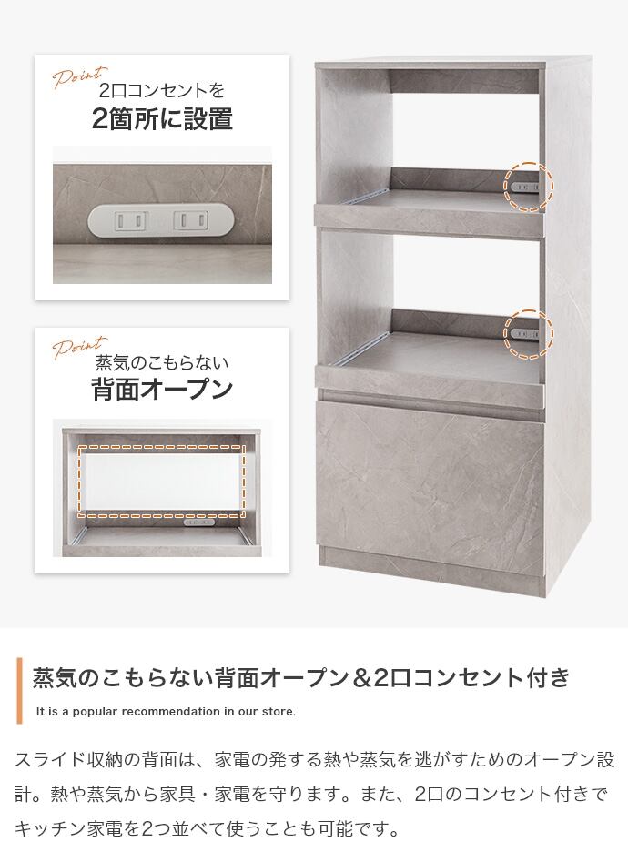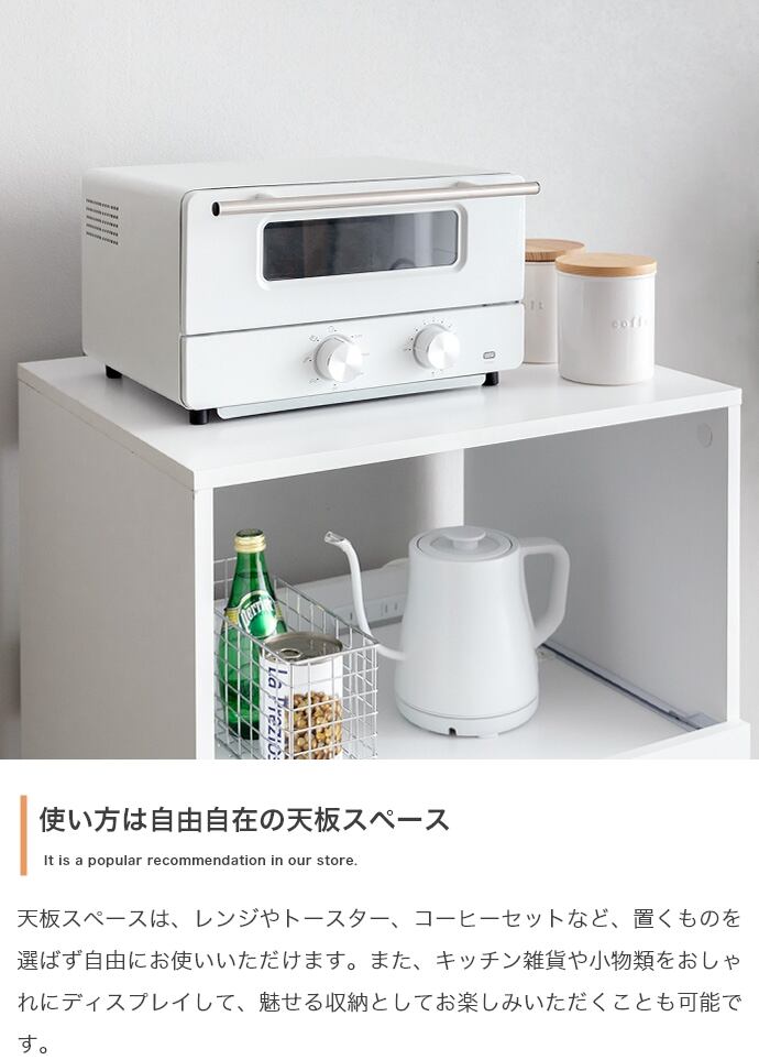 2つのスライドトレーでキッチン家電をスッキリ収納できるレンジ台。