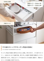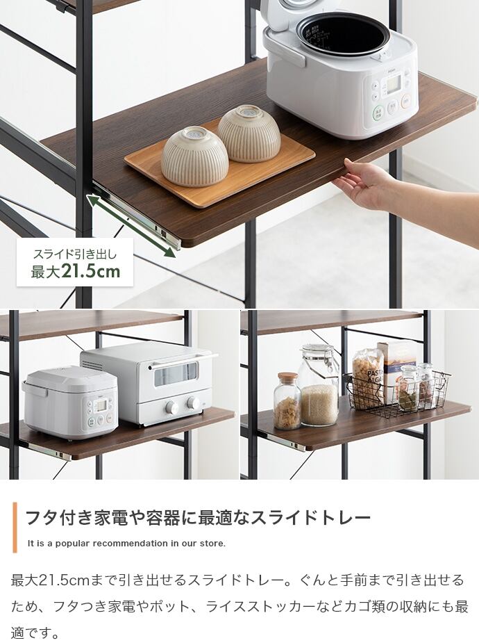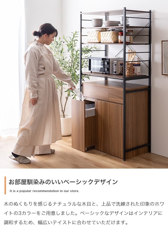 隠しキャスター付きのゴミ箱に加え、炊飯器やポットの収納に便利なスライドトレーや、使い勝手の良い可動式収納棚も備え、機能性も抜群です。