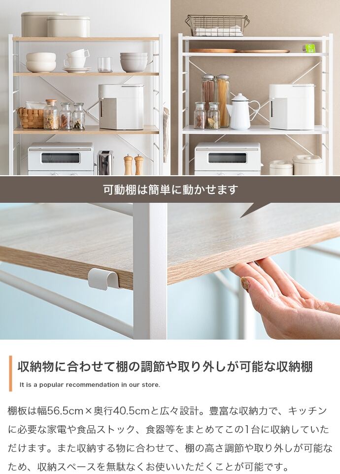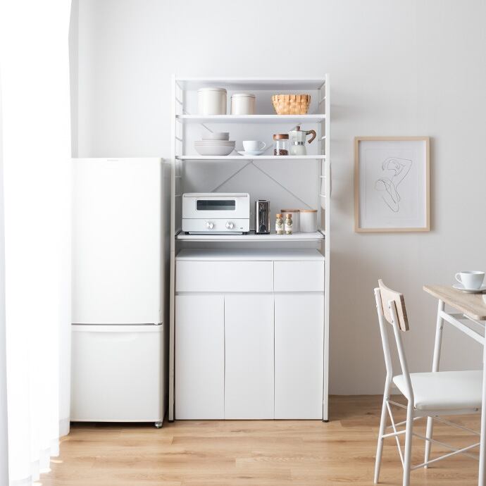 隠しキャスター付きのゴミ箱に加え、炊飯器やポットの収納に便利なスライドトレーや、使い勝手の良い可動式収納棚も備え、機能性も抜群です。