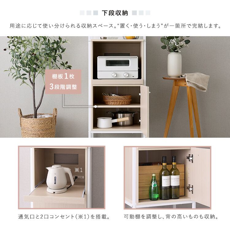 スライド棚には2口コンセントが付いているので、炊飯器やレンジをおいてもOK!
