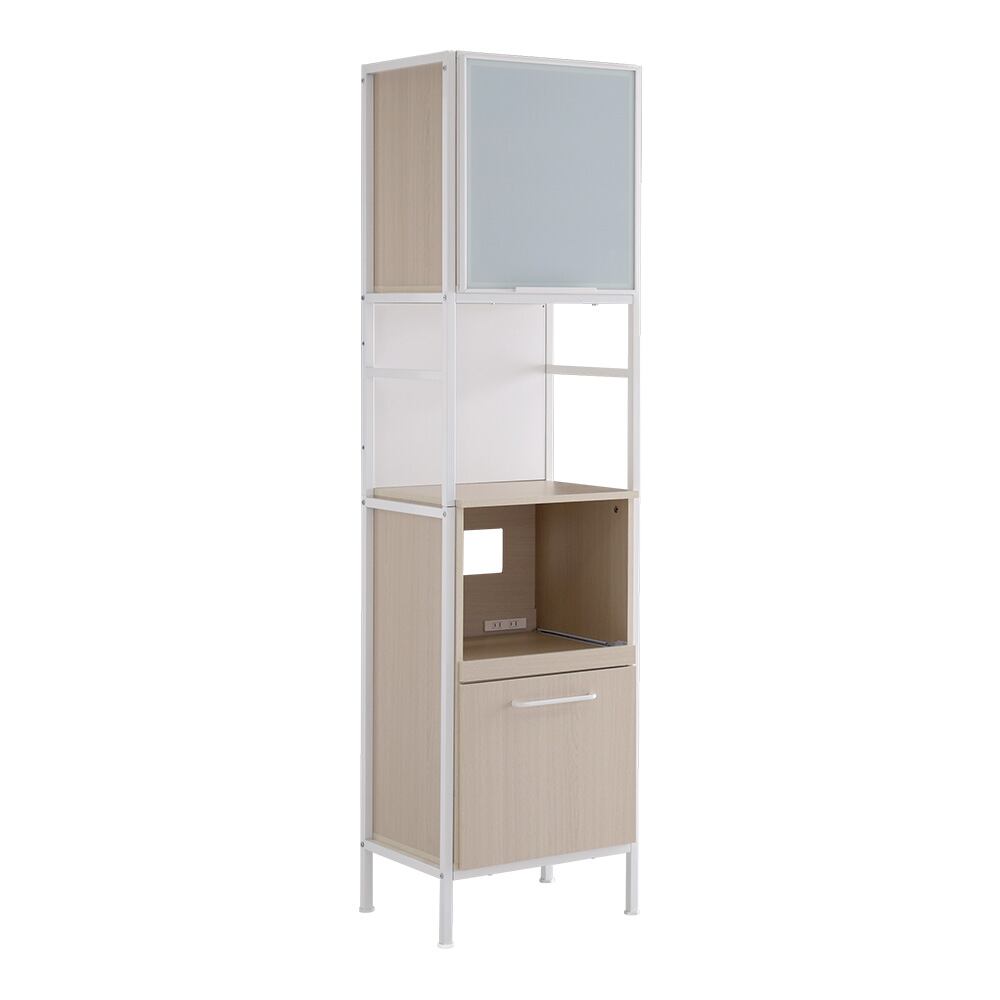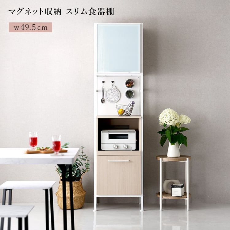 食器棚 キッチンボード マグネット収納 スリム 幅43cm ホワイトスモークガラス ナチュラル木目 キッチンラック