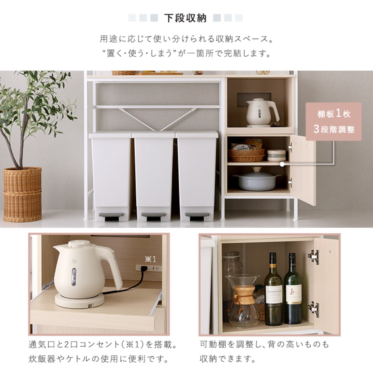 スライド棚には2口コンセントが付いているので、炊飯器やレンジをおいてもOK!