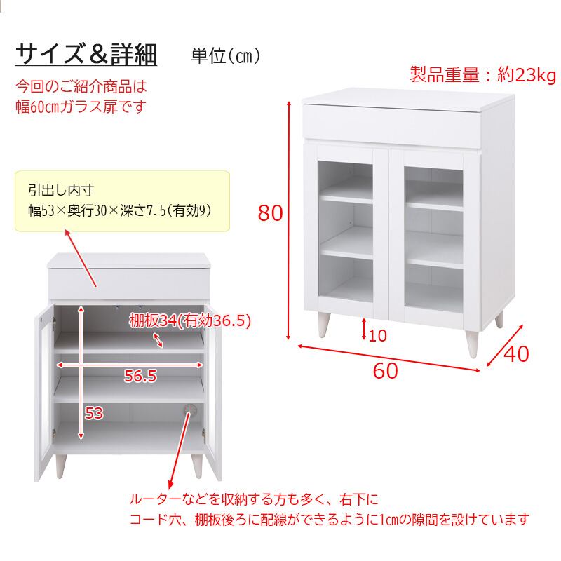 ■扉内寸/(約)幅53.5(有効56.5)×奥行36.5(棚板34・後部1cm配線用隙間あり)×高さ53(マグネット下まで51.5)cm
