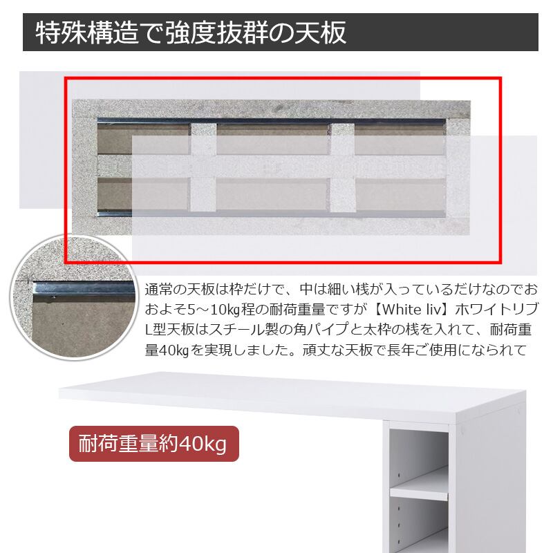 特殊構造で強度抜群の天板は、通常の天板は枠だけで、中は細い桟が入っているだけなのでおおよそ5〜10kg程の耐荷重量ですが、こちらのL型天板はスチール製の角パイプと太枠の桟を入れて耐荷重量40kgを実現しました。