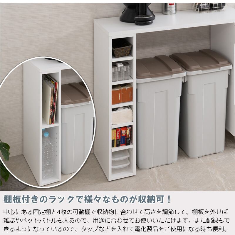 中心にある固定棚と4枚の可動棚で収納物に合わせて高さを調節して棚板を外せば、雑誌やペットボトルも入るので、用途に合わせてお使いいただけます。