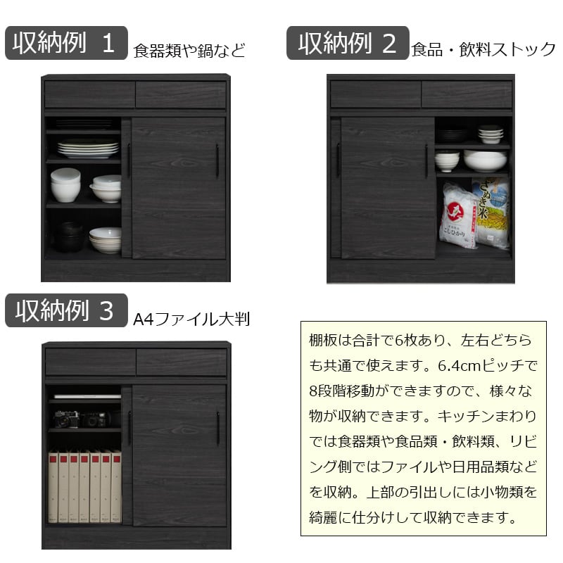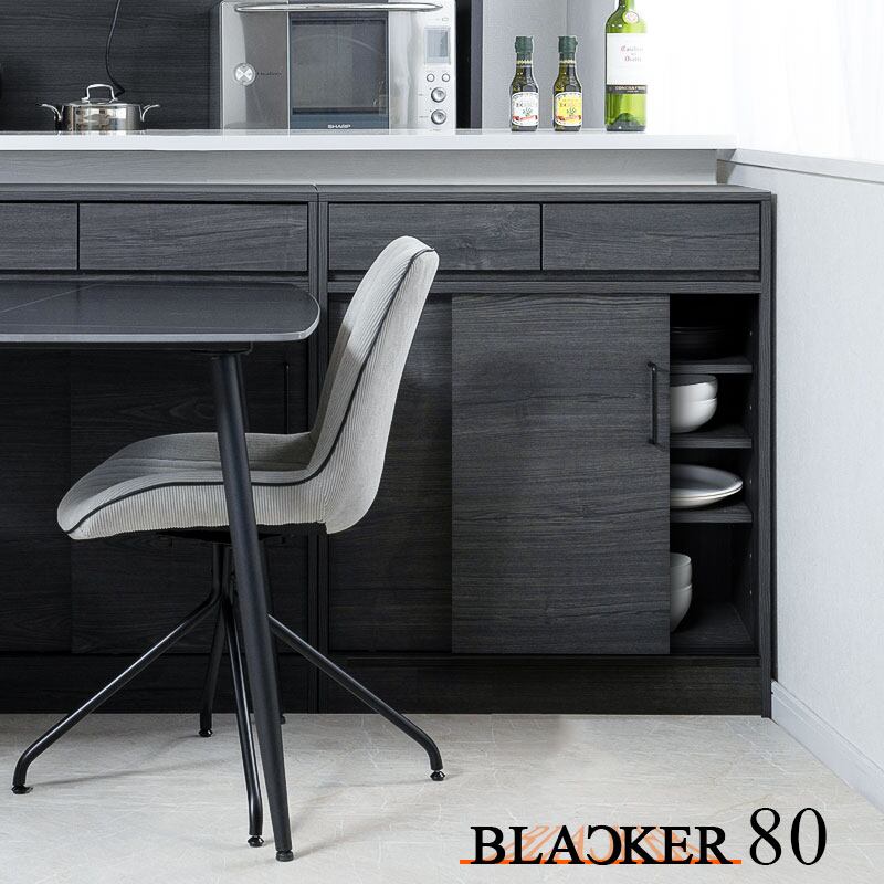 キャビネット カウンター下収納 幅80 ブラック 背面化粧仕上げ キッチン収納 引き戸 食器収納 食器棚 ラック 可動棚 間仕切り 木製 ストッカー blacker