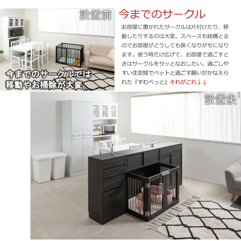 収納も付いたドッグサークルは、愛犬をサークルに入れるときだけ広げるので、普段は収納キャビネットのように使えるのが魅力!