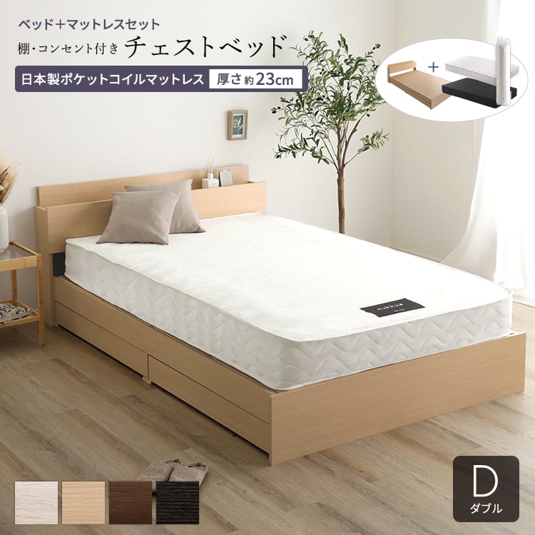チェストベッド 日本製ポケットコイルマットレスセット (ダブル) 木目調 オーク色 全4色 宮付 棚・コンセント付き 引出し収納ベッド 抗菌・防臭