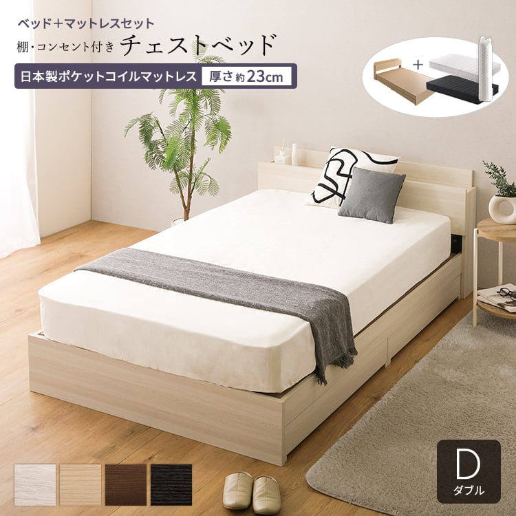 チェストベッド 日本製ポケットコイルマットレスセット (ダブル) 木目調 ホワイトオーク色 全4色 宮付 棚・コンセント付き 引出し収納ベッド 抗菌・防臭