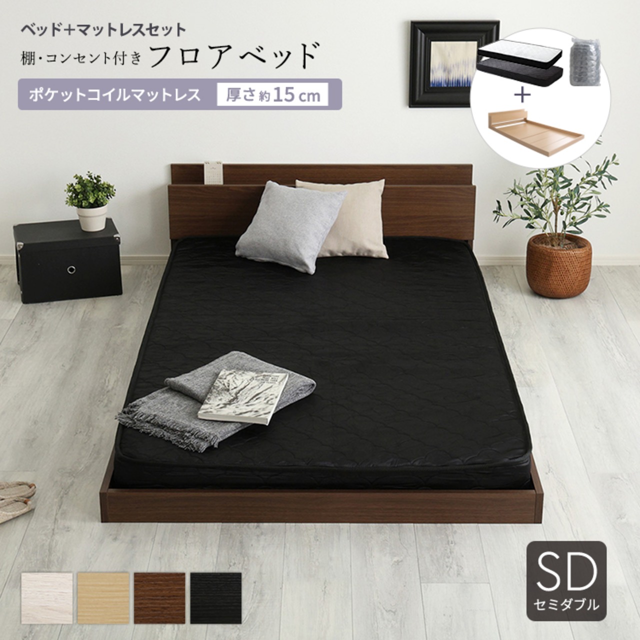 フロアベッド ポケットコイルマットレスセット (セミダブル) ローベッド 木目調 ウォールナット色 全4色 宮付 棚・コンセント付き 抗菌・防臭