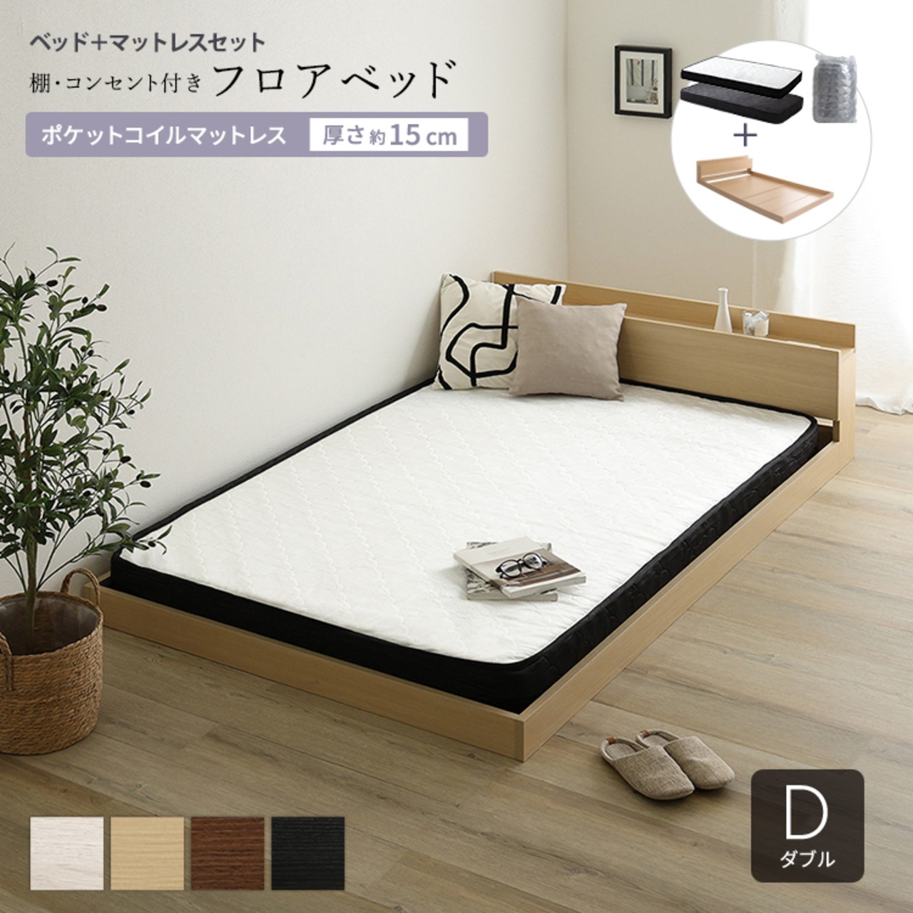 フロアベッド ポケットコイルマットレスセット (ダブル) ローベッド 木目調 オーク色 全4色 宮付 棚・コンセント付き 抗菌・防臭