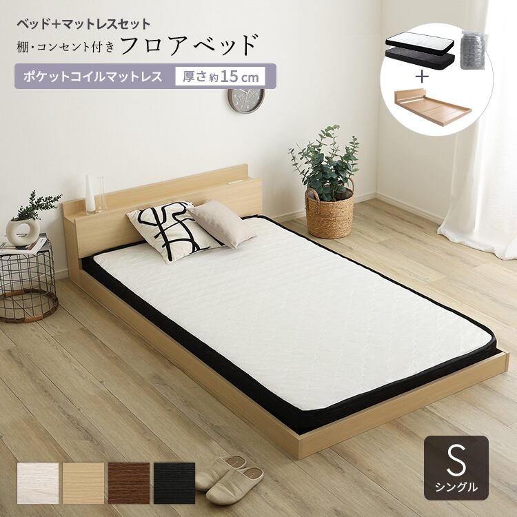 フロアベッド ポケットコイルマットレスセット (シングル) ローベッド 木目調 オーク色 全4色 宮付 棚・コンセント付き 抗菌・防臭