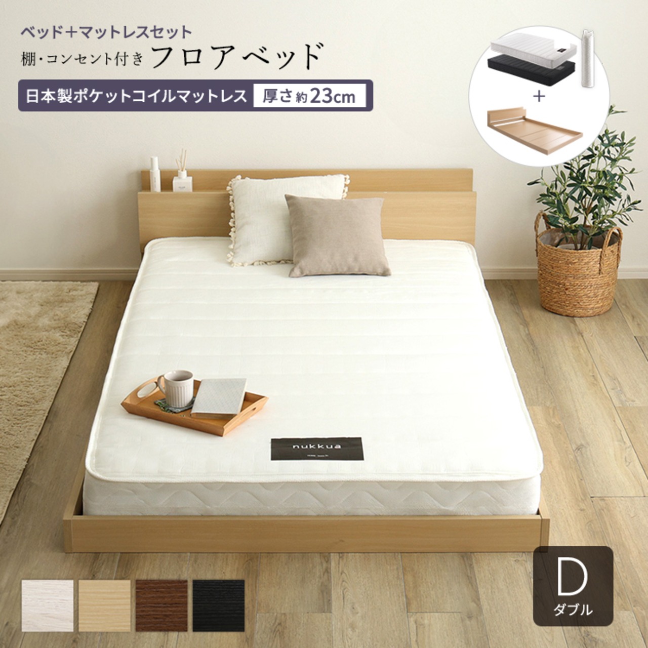 フロアベッド 日本製ポケットコイルマットレスセット (ダブル) ローベッド 木目調 オーク色 全4色 宮付 棚・コンセント付き 抗菌・防臭