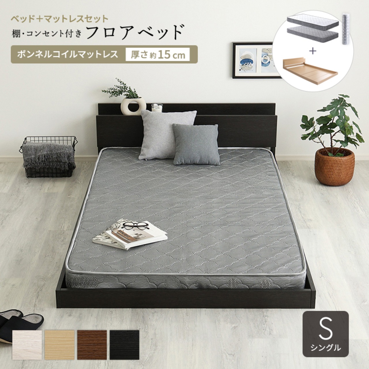 フロアベッド ボンネルコイルマットレスセット (シングル) ローベッド 木目調 ブラックオーク色 全4色 宮付 棚・コンセント付き 抗菌・防臭
