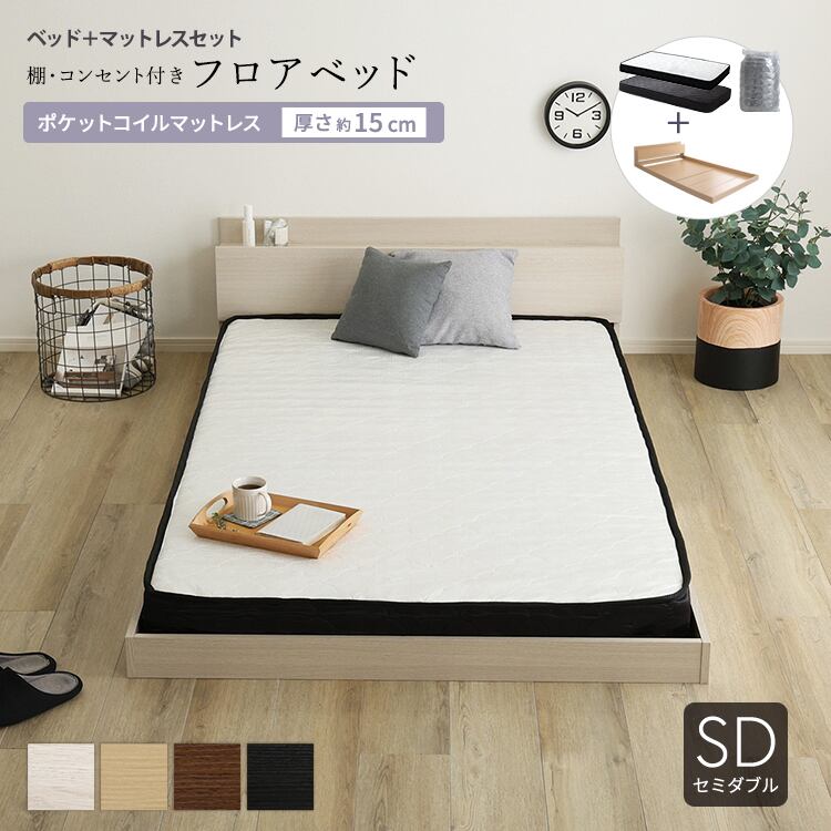 フロアベッド ポケットコイルマットレスセット (セミダブル) ローベッド 木目調 ホワイトオーク色 全4色 宮付 棚・コンセント付き 抗菌・防臭