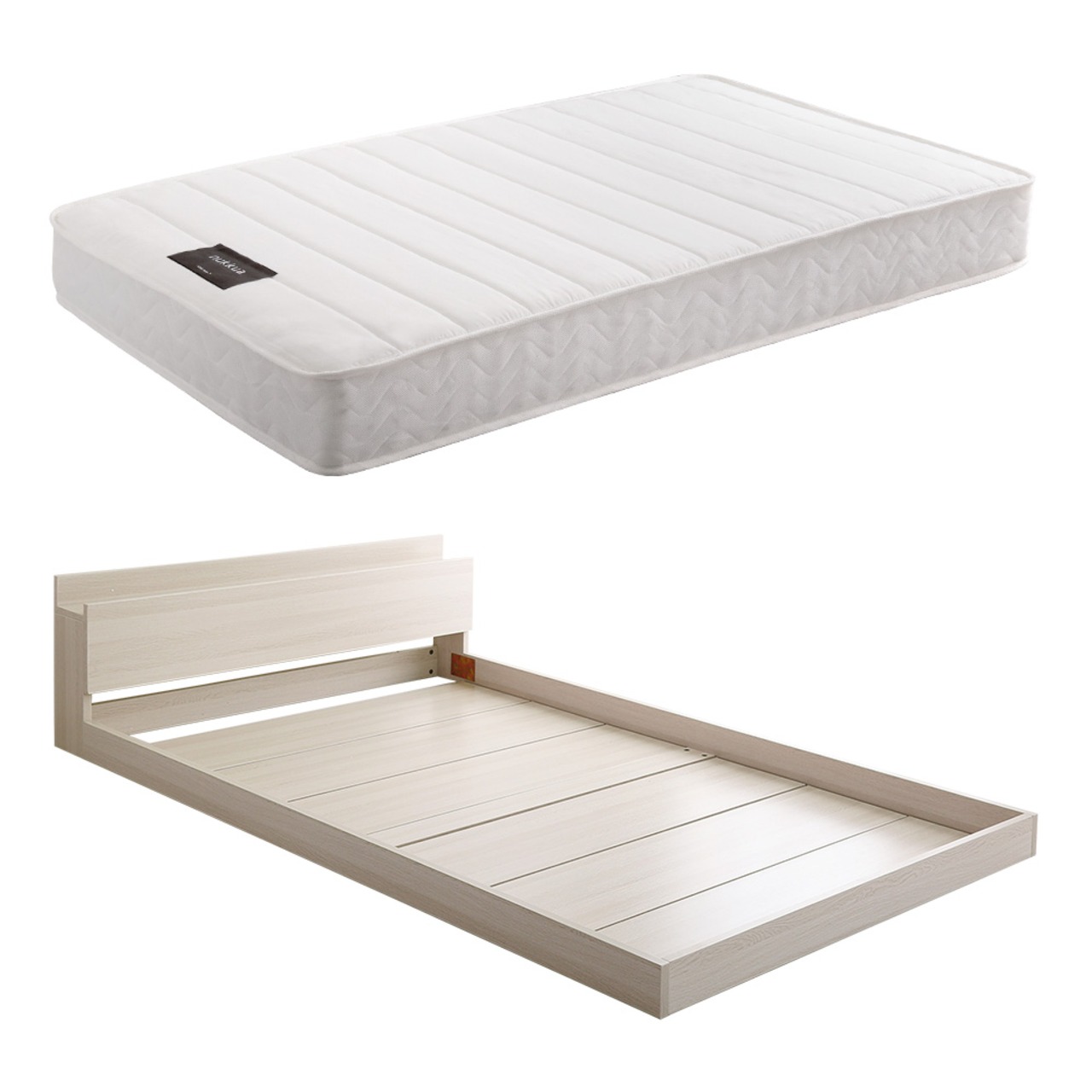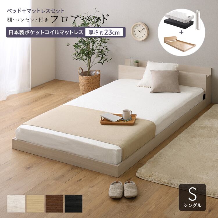 フロアベッド 日本製ポケットコイルマットレスセット (シングル) ローベッド 木目調 ホワイトオーク色 全4色 宮付 棚・コンセント付き 抗菌・防臭