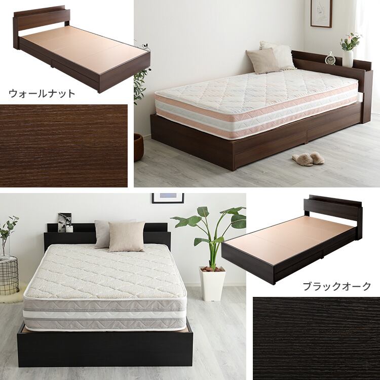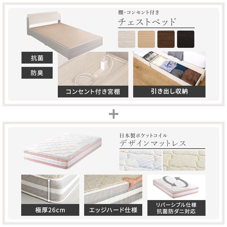 チェストベッド 日本製ポケットコイルマットレスセット (セミダブル) 木目調 ブラックオーク色 全4色 宮付 棚・コンセント付き 引出し収納ベッド 抗菌・防臭