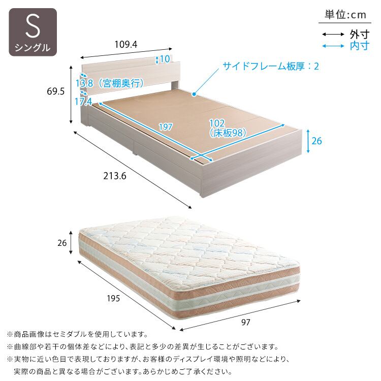 ベッド:(約)幅109.4×奥行213.6×高さ69.5cm
