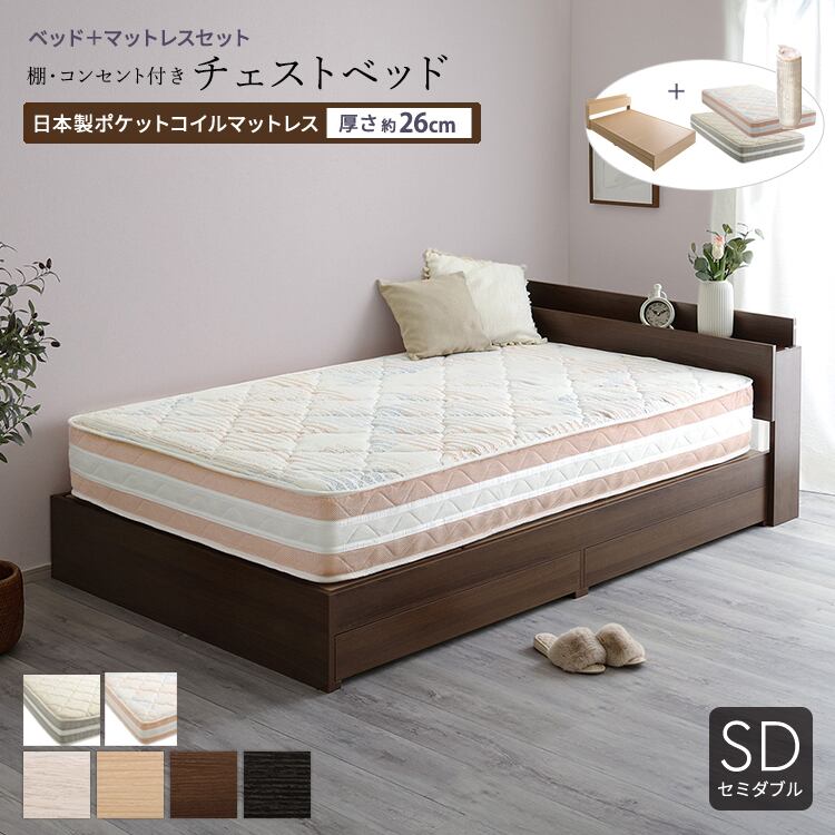 チェストベッド 日本製ポケットコイルマットレスセット (セミダブル) 木目調 ブラックオーク色 全4色 宮付 棚・コンセント付き 引出し収納ベッド 抗菌・防臭