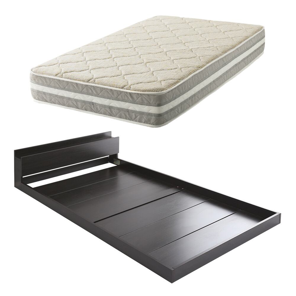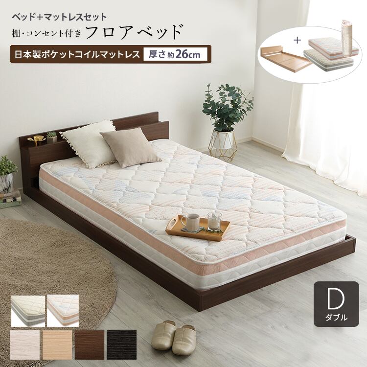 フロアベッド 日本製ポケットコイルマットレスセット (ダブル) 木目調 全4色 宮付 棚・コンセント付き ウォールナット色 オーク色