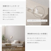 ベッドはタブレットも立て掛けられる宮棚・2口コンセント付き。