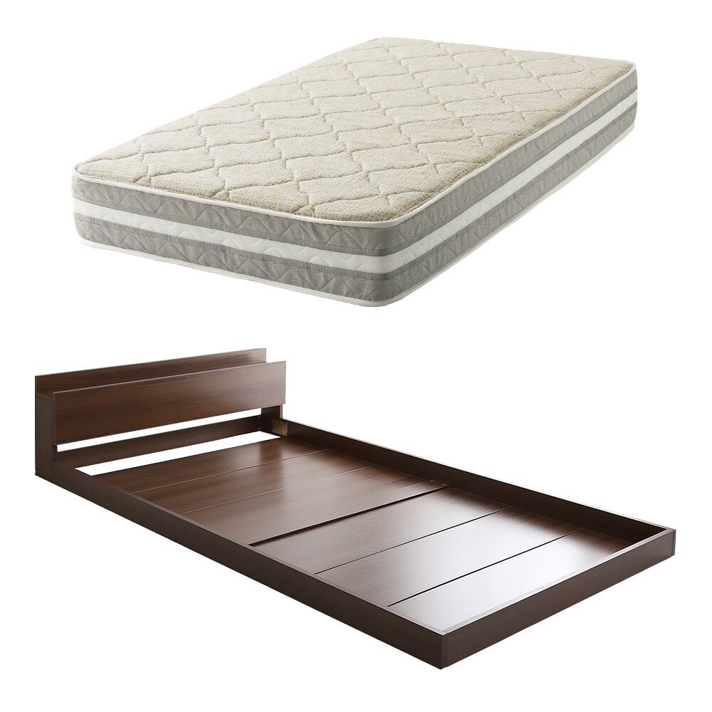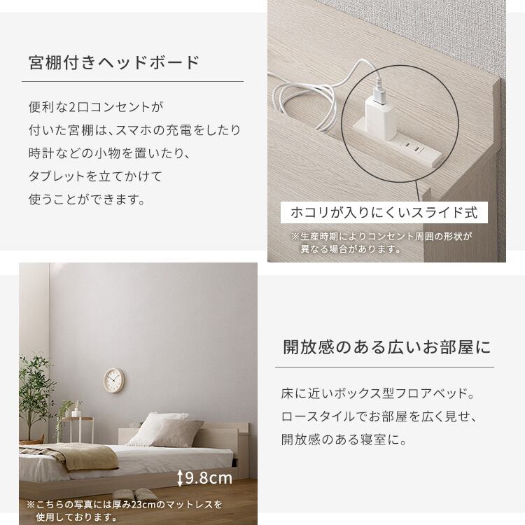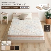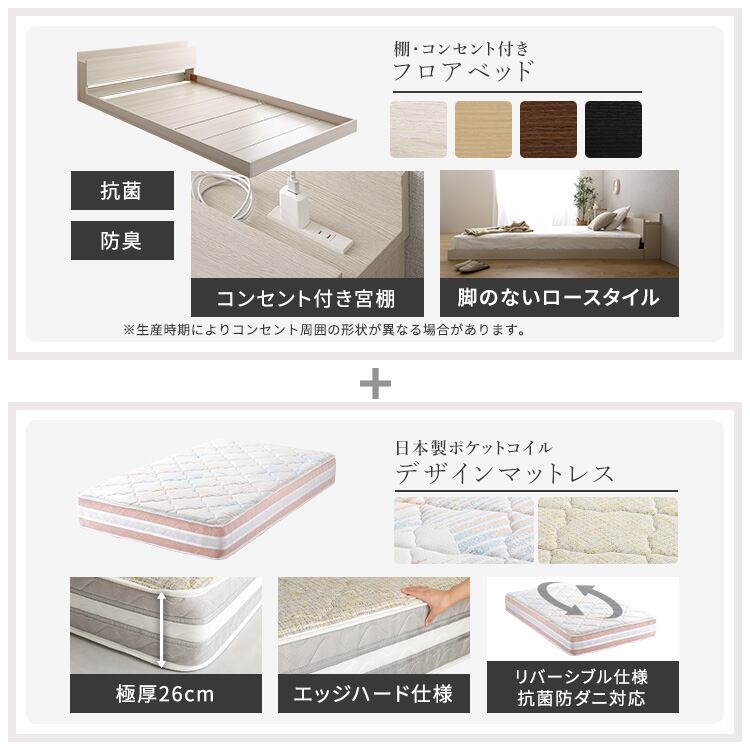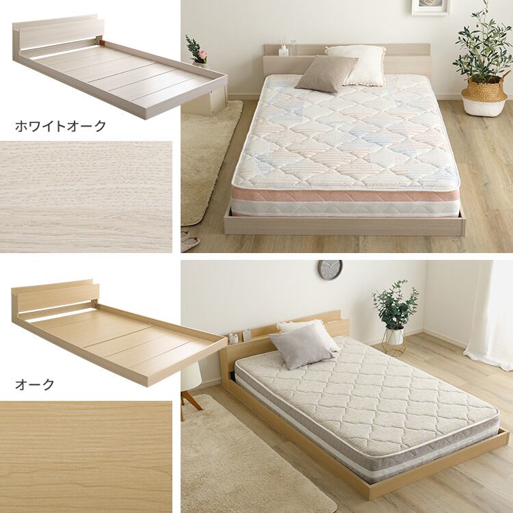 フロアベッド 日本製ポケットコイルマットレスセット (ダブル) 木目調 ホワイトオーク色 全4色 宮付 棚・コンセント付き オーク色