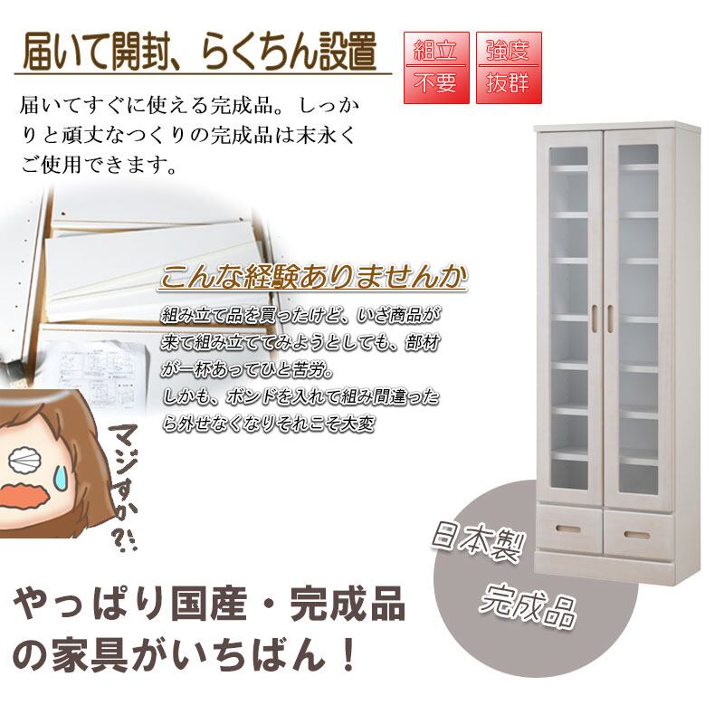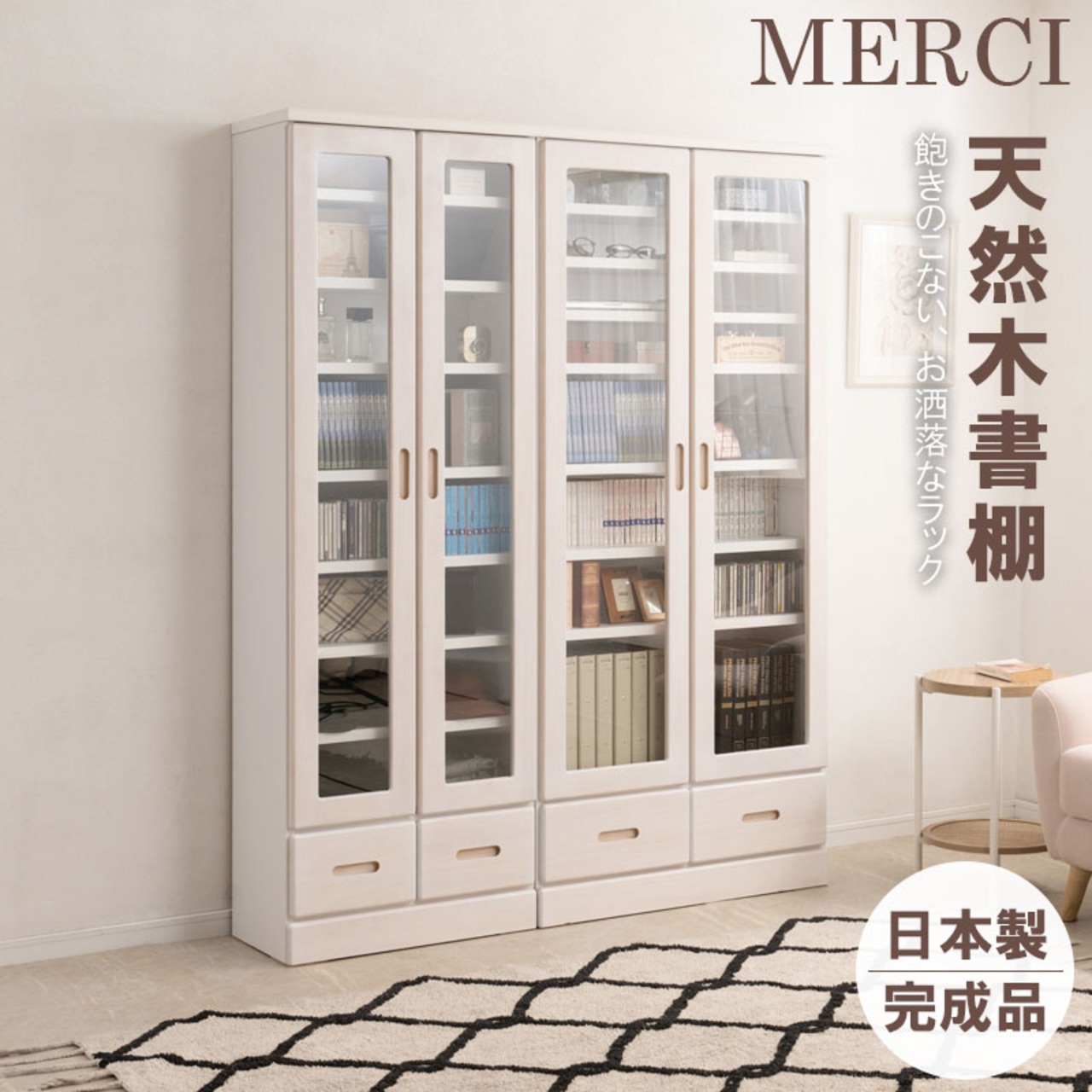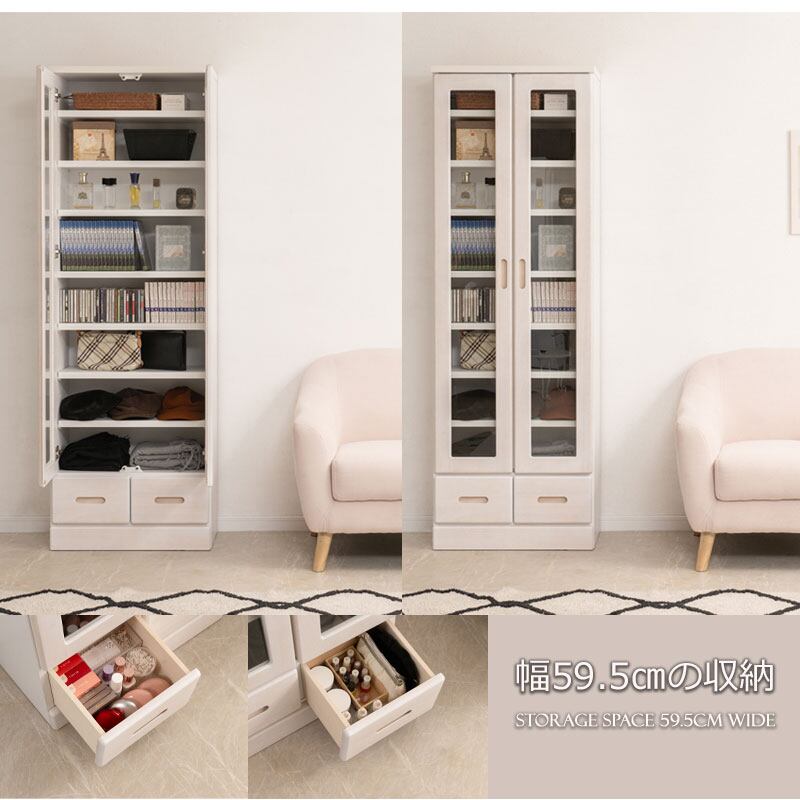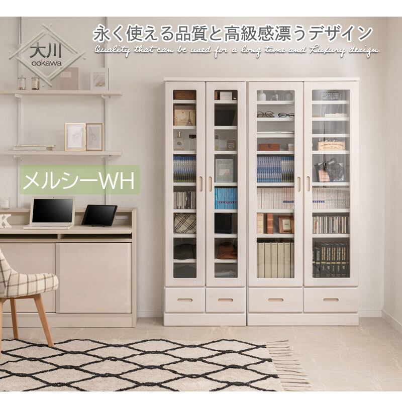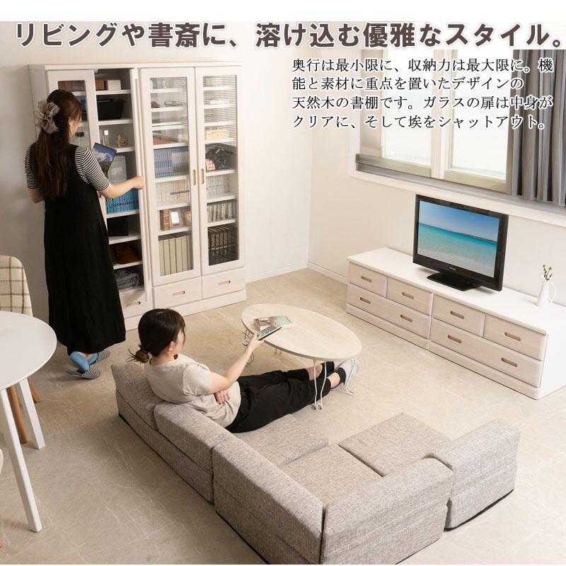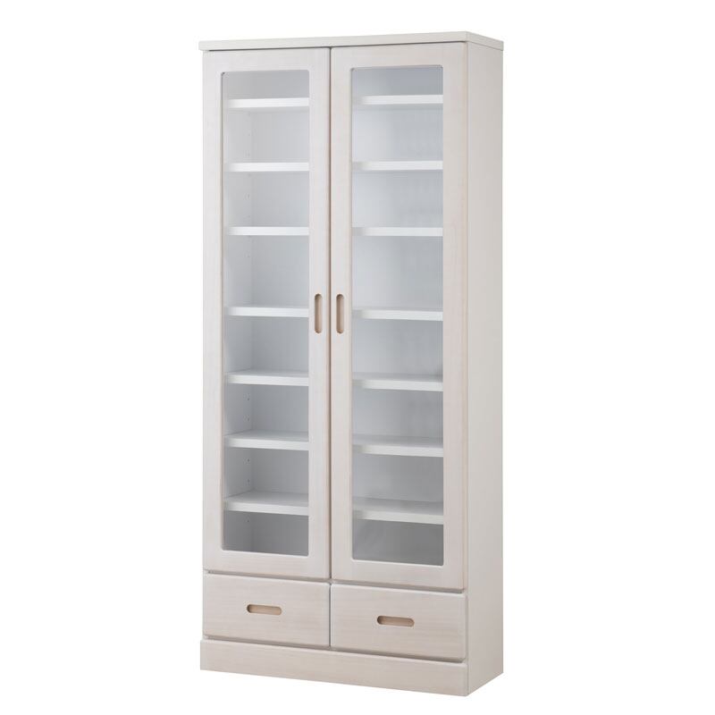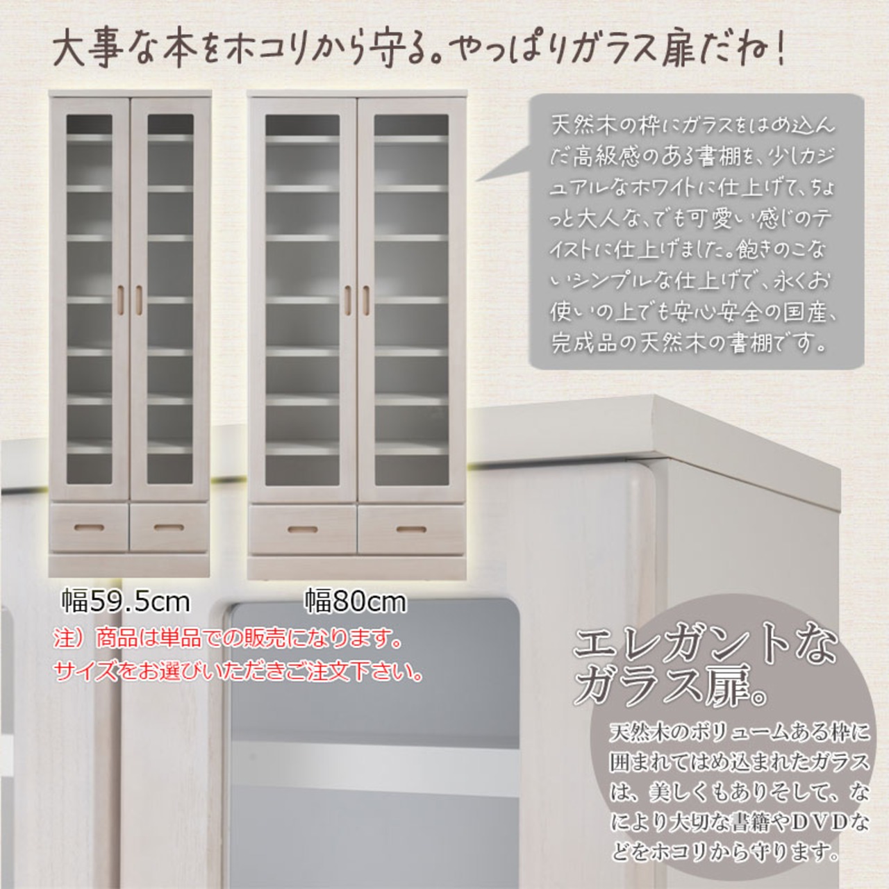 本棚 幅80cm ガラスキャビネット 日本製 完成品 天然木 桐 ホワイトウォッシュ リビングボード ガラス扉 引出し 収納棚 省スペース収納家具 書棚 MRCI