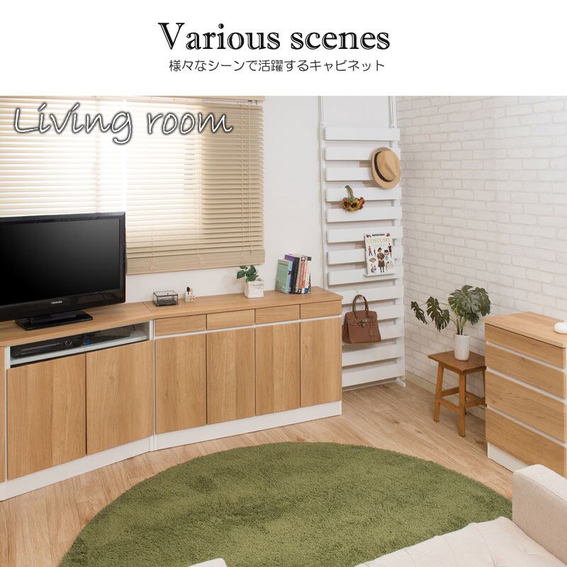 4段チェストやガラスと一体化したコーナーキャビネット、引出し付きキャビネットなどシンプルながら機能性もしっかりと装備し、リビングボードとして、TVボードとして、またキッチンカウンターとして様々な使い方が可能。