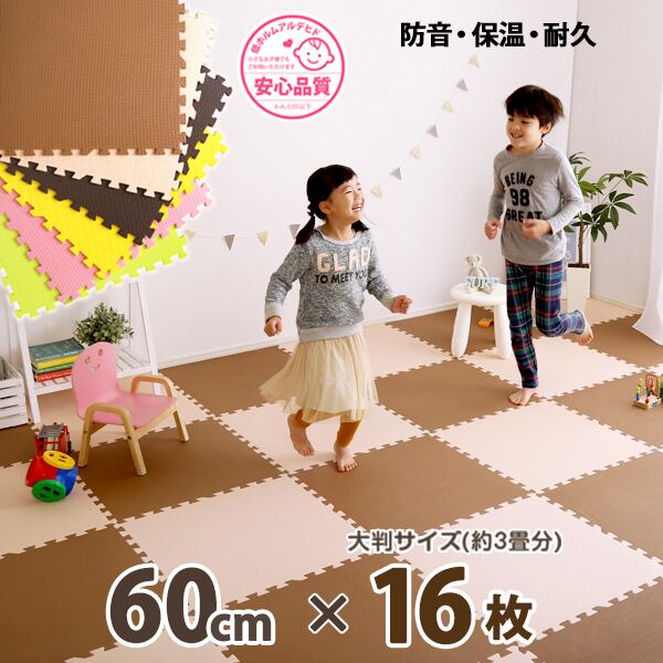 ジョイントマット 16枚セット(大判60cm)3畳分 全8色 サイドバー付 安心の低ホルムアルデヒド、防音、保温 シンプル