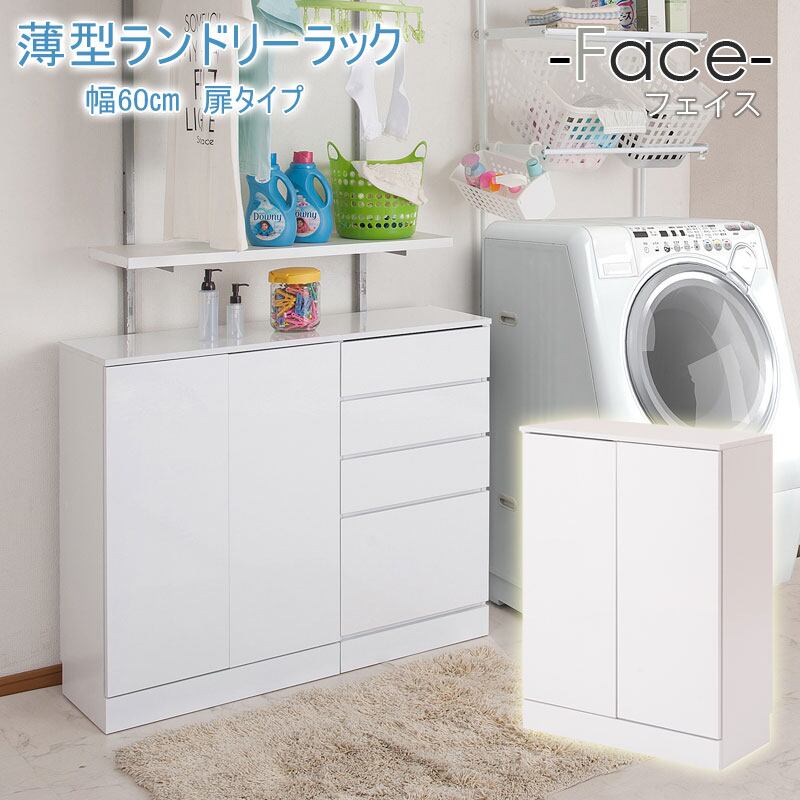 ランドリーキャビネット 薄型 幅60cm 開き戸収納 洗面所収納 スリム ランドリー収納 光沢ホワイト色 省スペース 可動棚多め FCE