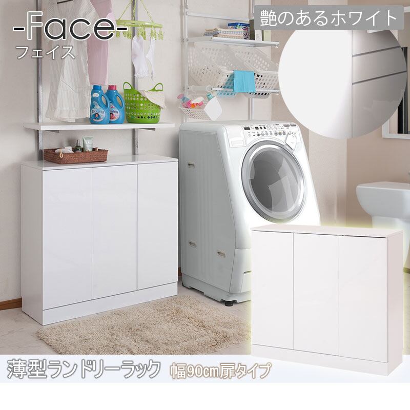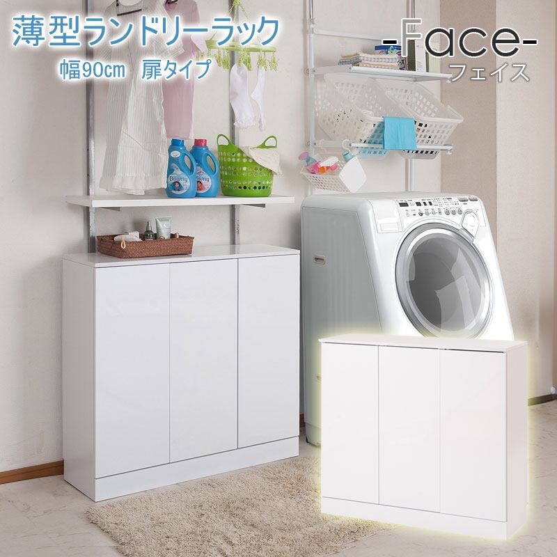 ランドリーキャビネット 薄型 幅90cm 開き戸収納 洗面所収納 スリム ランドリー収納 光沢ホワイト色 省スペース 可動棚多め FCE