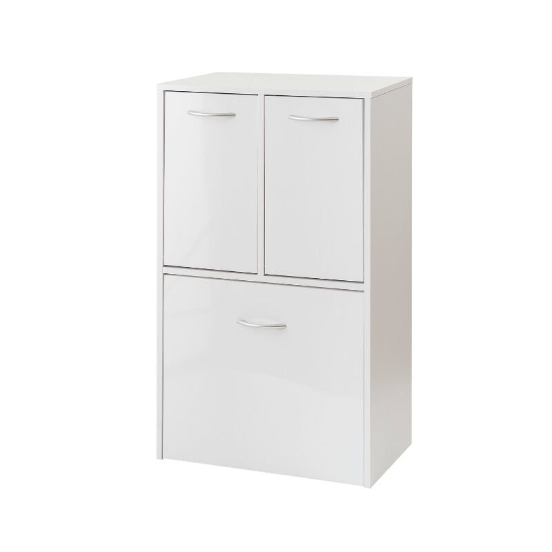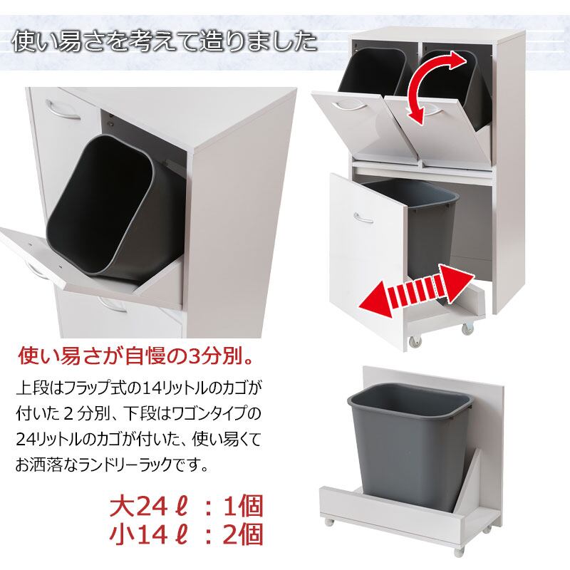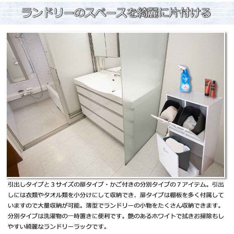 ランドリーラック 薄型 幅54.5cm 3分別 キャスター付き 洗面所収納 脱衣所収納 スリム 光沢ホワイト色 ランドリー収納 FCE