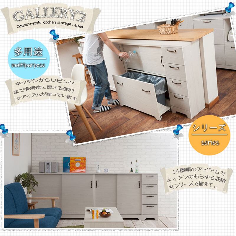 カウンター下やリビングなど様々なシーンで活躍する薄型キャビネットは幅90、110にダストボックスまで取りそろえ、インテリア度アップ。